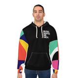 Featuring a spacious front pocket and a hood with a drawstring, this hoodie combines practicality with style. The classic fit ensures it flatters every body type, while the white thread color adds a clean, polished finish. Custom cut and sewn with care, this hoodie is assembled in the USA from globally sourced parts, ensuring quality craftsmanship. Elevate your wardrobe with the Music Makes Me High All-Over Print Pullover Hoodie today!