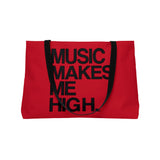 The Music Makes Me High personalized weekender bag is designed for those who love to travel light, measuring a convenient 24" x 13" (60.9 cm x 33 cm). Its t-bottom construction and sleek black handles give it a classic look, making it perfect for weekend getaways or day trips. Crafted from 100% spun polyester, this bag features an all-over print that showcases your unique art in vibrant colors against a stylish black interior lining. Assembled in the USA from globally sourced parts, this weekender bag combines practicality with personalization, ensuring you travel in style. Get ready to hit the road with your custom creation!