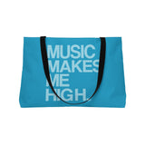 The Music Makes Me High personalized weekender bag is designed for those who love to travel light, measuring a convenient 24" x 13" (60.9 cm x 33 cm). Its t-bottom construction and sleek black handles give it a classic look, making it perfect for weekend getaways or day trips. Crafted from 100% spun polyester, this bag features an all-over print that showcases your unique art in vibrant colors against a stylish black interior lining. Assembled in the USA from globally sourced parts, this weekender bag combines practicality with personalization, ensuring you travel in style. Get ready to hit the road with your custom creation!