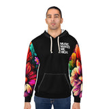 Featuring a spacious front pocket and a hood with a drawstring, this hoodie combines practicality with style. The classic fit ensures it flatters every body type, while the white thread color adds a clean, polished finish. Custom cut and sewn with care, this hoodie is assembled in the USA from globally sourced parts, ensuring quality craftsmanship. Elevate your wardrobe with the Music Makes Me High All-Over Floral Print Pullover Hoodie today!