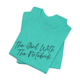 Inspired by the beloved online creator, "The Girl with the Notebook," this classic unisex jersey short-sleeve tee combines comfort and style. Known for her humorous and motivational content on TikTok and Instagram, she has captured the hearts of millions with her quirky insights and inspiring stories. Made from soft, breathable 100% Airlume combed and ring-spun cotton, this tee is perfect for active and leisure wear.