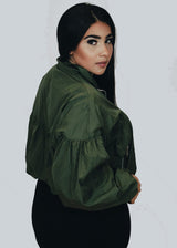 - Description: Give a 90’s Vibe with this olive crop jacket. Lightweight and perfect for Fall.