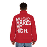 The Music Makes Me High men's puffer jacket is a grade-A upgrade for any wardrobe. Featuring a stand-up collar and quilted lining, this jacket combines style with functionality, offering two spacious side pockets for added practicality. Lightweight and super soft to the touch, it ensures comfort while keeping you warm. Made with a 100% polyester outer layer and a 100% black polyester cotton-like quilted lining, this regular fit jacket is perfect for layering.