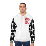 Featuring a spacious front pocket and a hood with a drawstring, this hoodie combines practicality with style. The classic fit ensures it flatters every body type, while the white thread color adds a clean, polished finish. Custom cut and sewn with care, this hoodie is assembled in the USA from globally sourced parts, ensuring quality craftsmanship. Elevate your wardrobe with the Music Makes Me High All-Over Print Pullover Hoodie today!