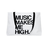 The Music Makes Me High personalized weekender bag is designed for those who love to travel light, measuring a convenient 24" x 13" (60.9 cm x 33 cm). Its t-bottom construction and sleek black handles give it a classic look, making it perfect for weekend getaways or day trips. Crafted from 100% spun polyester, this bag features an all-over print that showcases your unique art in vibrant colors against a stylish black interior lining. Assembled in the USA from globally sourced parts, this weekender bag combines practicality with personalization, ensuring you travel in style. Get ready to hit the road with your custom creation!