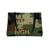 The Music Makes Me High personalized weekender bag is designed for those who love to travel light, measuring a convenient 24" x 13" (60.9 cm x 33 cm). Its t-bottom construction and sleek black handles give it a classic look, making it perfect for weekend getaways or day trips. Crafted from 100% spun polyester, this bag features an all-over print that showcases your unique art in vibrant colors against a stylish black interior lining. Assembled in the USA from globally sourced parts, this weekender bag combines practicality with personalization, ensuring you travel in style. Get ready to hit the road with your custom creation!