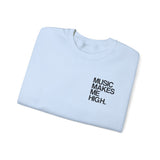 The ribbed cuffs and waistband provide a snug fit, perfect for layering or wearing alone. This sweatshirt is a versatile staple for any music lover's closet, ideal for casual outings, cozy nights in, or simply chilling with friends. Make a statement and let your love for music shine through with the "Music Makes Me High" Sweatshirt!