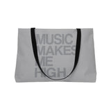 The Music Makes Me High personalized weekender bag is designed for those who love to travel light, measuring a convenient 24" x 13" (60.9 cm x 33 cm). Its t-bottom construction and sleek black handles give it a classic look, making it perfect for weekend getaways or day trips. Crafted from 100% spun polyester, this bag features an all-over print that showcases your unique art in vibrant colors against a stylish black interior lining. Assembled in the USA from globally sourced parts, this weekender bag combines practicality with personalization, ensuring you travel in style. Get ready to hit the road with your custom creation!
