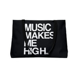 The Music Makes Me High personalized weekender bag is designed for those who love to travel light, measuring a convenient 24" x 13" (60.9 cm x 33 cm). Its t-bottom construction and sleek black handles give it a classic look, making it perfect for weekend getaways or day trips. Crafted from 100% spun polyester, this bag features an all-over print that showcases your unique art in vibrant colors against a stylish black interior lining. Assembled in the USA from globally sourced parts, this weekender bag combines practicality with personalization, ensuring you travel in style. Get ready to hit the road with your custom creation!