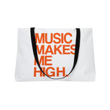 The Music Makes Me High personalized weekender bag is designed for those who love to travel light, measuring a convenient 24" x 13" (60.9 cm x 33 cm). Its t-bottom construction and sleek black handles give it a classic look, making it perfect for weekend getaways or day trips. Crafted from 100% spun polyester, this bag features an all-over print that showcases your unique art in vibrant colors against a stylish black interior lining. Assembled in the USA from globally sourced parts, this weekender bag combines practicality with personalization, ensuring you travel in style. Get ready to hit the road with your custom creation!
